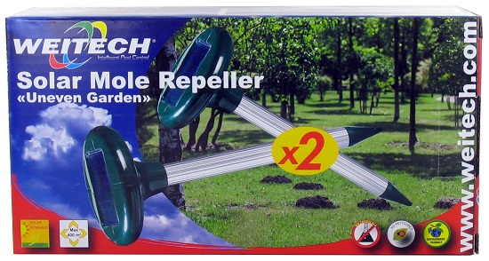 Weitech-WK2015 – комплект отпугивателей, который не оставляет вредителям ни шанса. В набор входят два прибора бельгийского производства, систематически издающих то звуковые колебания, то вибрации. Изделия заставляют кротов, медведок и прочих подземных жителей спасаться бегством. При этом для человека и более крупных животных они полностью безопасны.